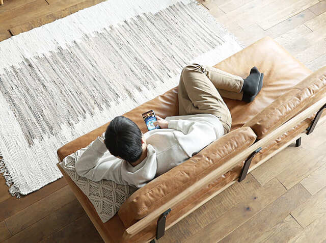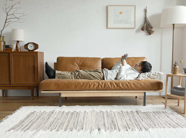 ソファーの座面幅は、182cmと大人の方が2人で座ったり、横に寝そべってくつろいだりできるサイズとなっています。モデル身長/約171cm