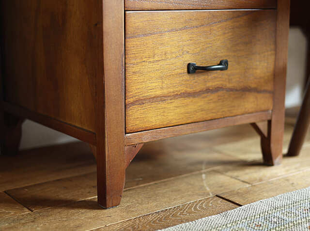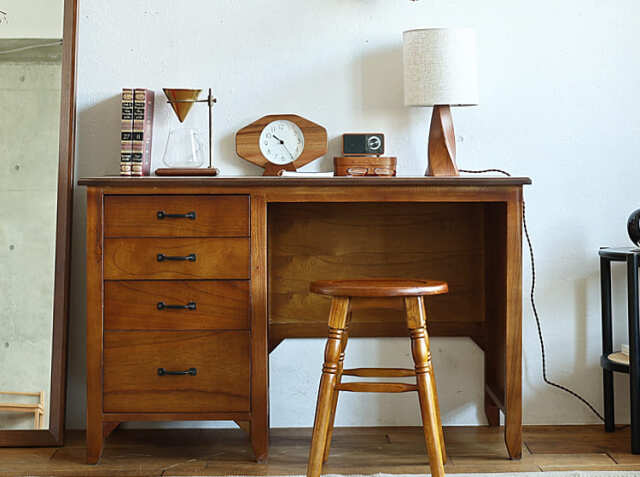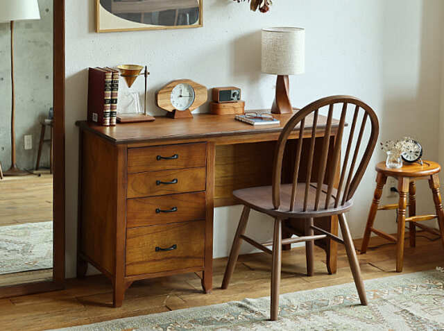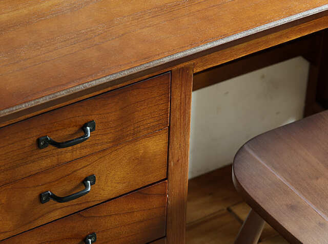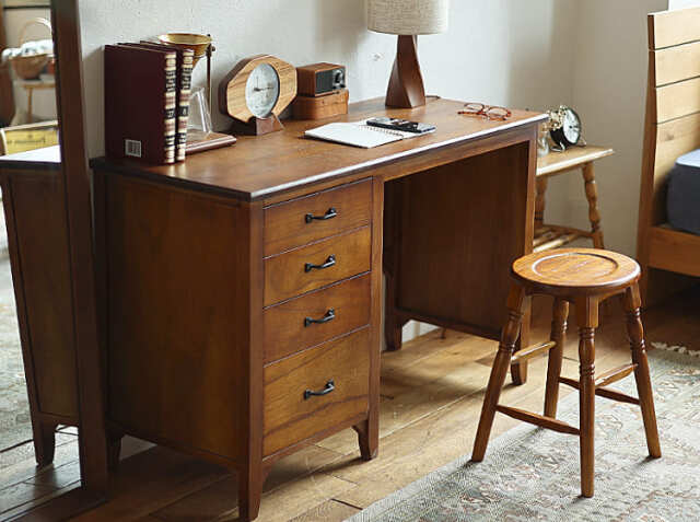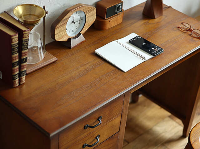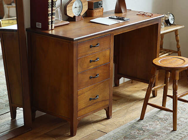 ヨーロッパのアンティーク家具のような味わい深いレトロテイストのデザインが特徴の引出し収納が4杯付いた幅112cmのデスク、Garba(ガルバ)。素材には高級家具や楽器などにも使われる天然木ミンディ材を使い、天然木の家具ならではの温もりや、使い古されたような風合いが、ほっこりとしたリラックス空間を演出してくれます。
