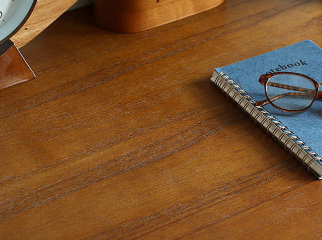 またパソコンなどのOA機器や書類などに囲まれ、無機質なイメージになりやすい書斎やワークスペースを一新してくれるのがこちらのデスク。ミンディ―材の落ち着いた雰囲気が、温かみを感じるデザインで書斎やワークスペースをセンスアップしてくれますよ。こちらのデスクに使われているミンディ―材は節ありとなっていますので、自然の温かみを感じることができますよ。