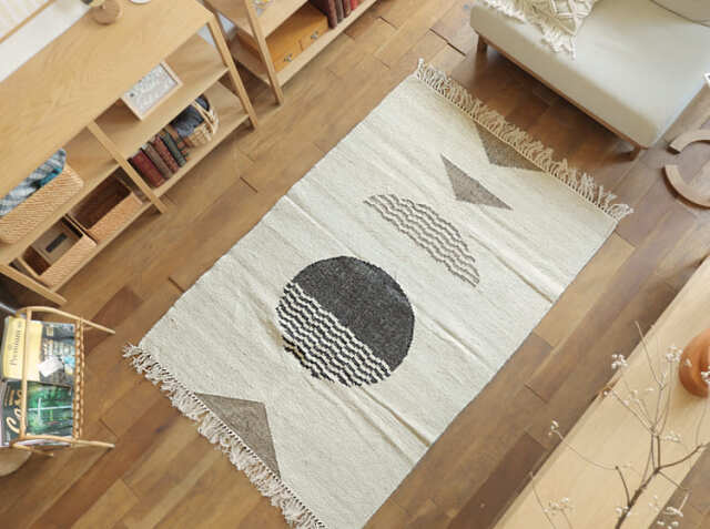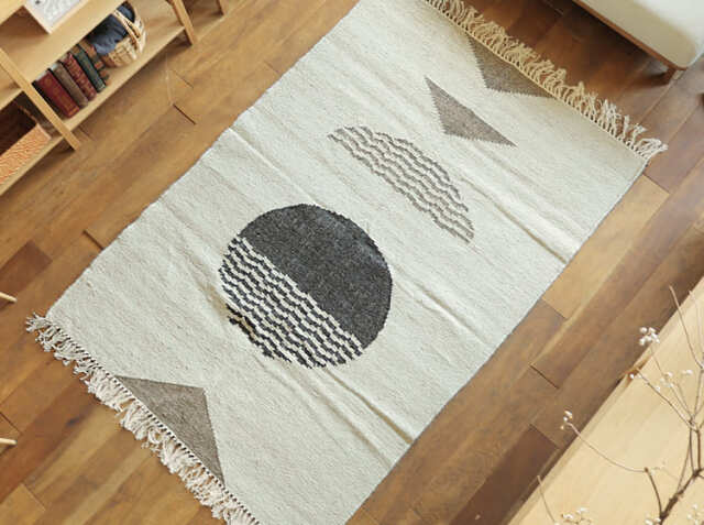 機械生産では感じることができない、インドの職人の方が、一つ一つ丁寧に織って作られています。素朴で温かみのある表情は、手織りだからこそ。素足で歩くと感じる心地よさがポイントですよ♪ホットカーペットにも対応していますので、1年中活躍するアイテムとなっています。