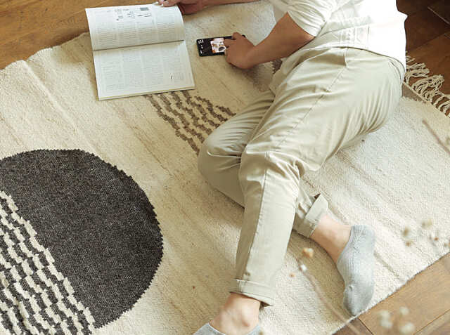 手機(てばた)を使用し、インドの職人の方により、ひとつずつ丁寧に織られたラグは、ひとつひとつから美しさや温かみを感じます。素足で歩くと感じるサラサラ感をお楽しみいただけるラグマットとなっています。