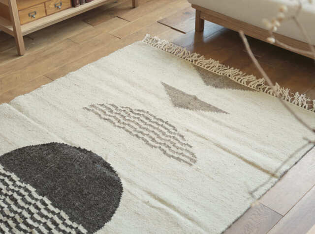 足に触れると感じるサラサラ感。幾何学的な模様を表現したデザインがナチュラルな雰囲気を感じさせます。 モダンなスタイルからレザーやウッドを使用した重厚感のあるスタイルまで幅広くコーディネートして頂けます。毛先がカットされずにクルッと輪になったループ状になっていて、サラリとしたウールの触り心地・踏み心地で、1年を通してサラリとした感触をお楽しみいただけます。天然素材ですので季節を問わずお使いいただけますよ。