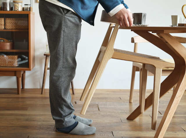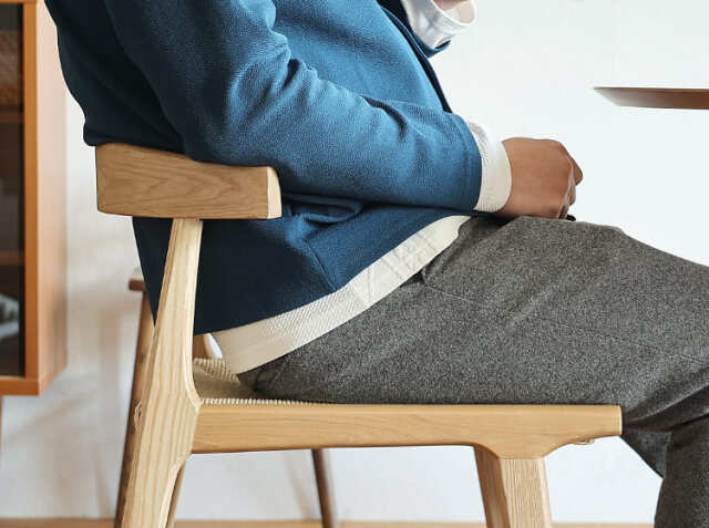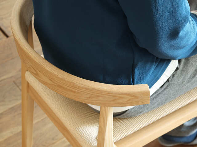 体を包み込んでくれるように弧を描いた背もたれ部分は、座った時にしっかり背中にフィットしてくれて安心感がうまれるデザインに仕上げています。カーブした背もたれは、座ったときに肘掛けの役割まで担ってくれますので、リラックスして食卓での時間を過ごすことができますよ。背もたれとひじ掛けが一体となったハーフアームデザインにすることで、見た目はスタイリッシュに仕上げ、そして肘掛が短い分、ダイニングテーブルに引き寄せやすく、椅子からの出入りもしやすくなっています。