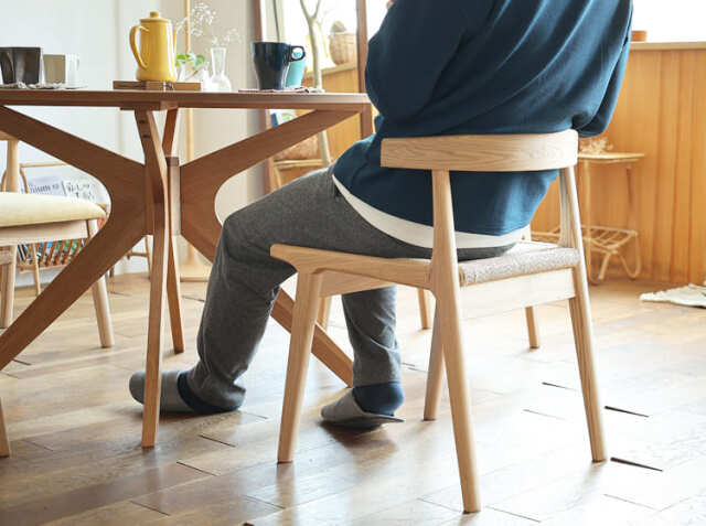 背もたれ部分は、天然木を曲木加工し、体にフィットする丸みのあるデザインとなっています。座面は、ウレタンをたっぷり詰めたほどよいクッション性で、包み込まれるような快適な座り心地に仕上げています。