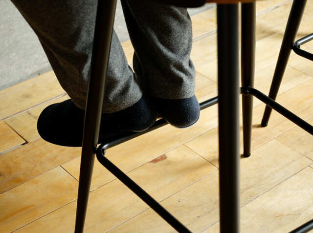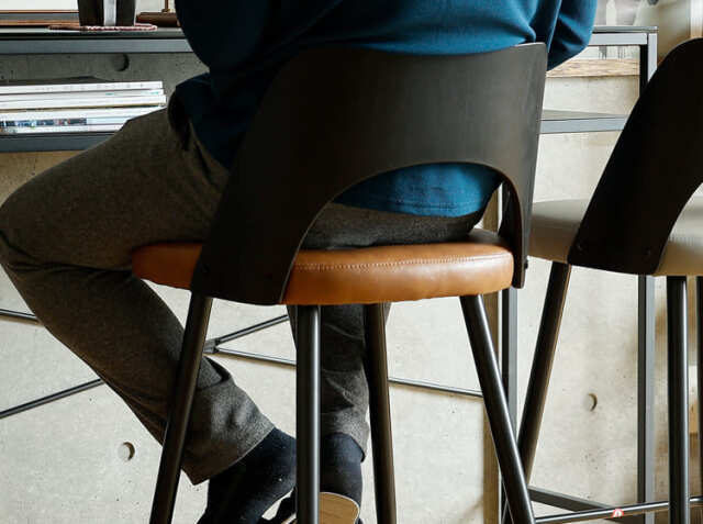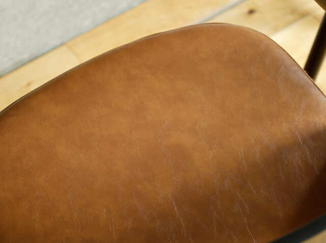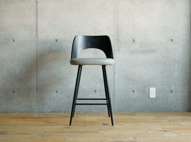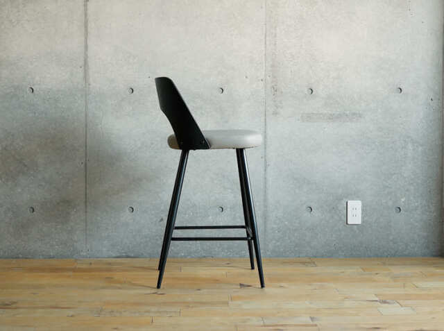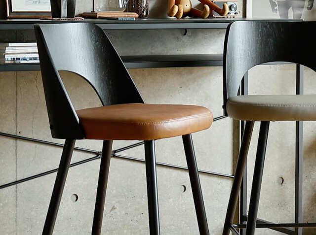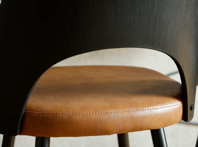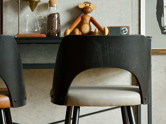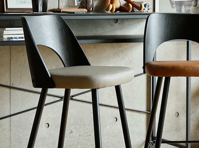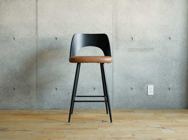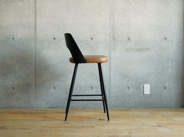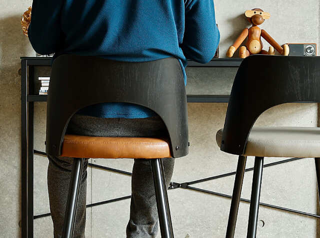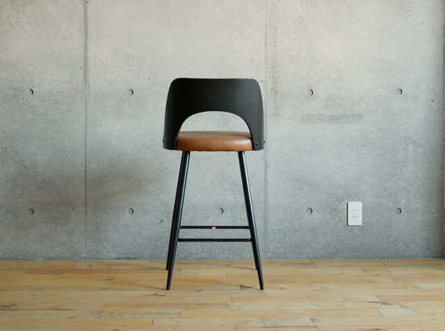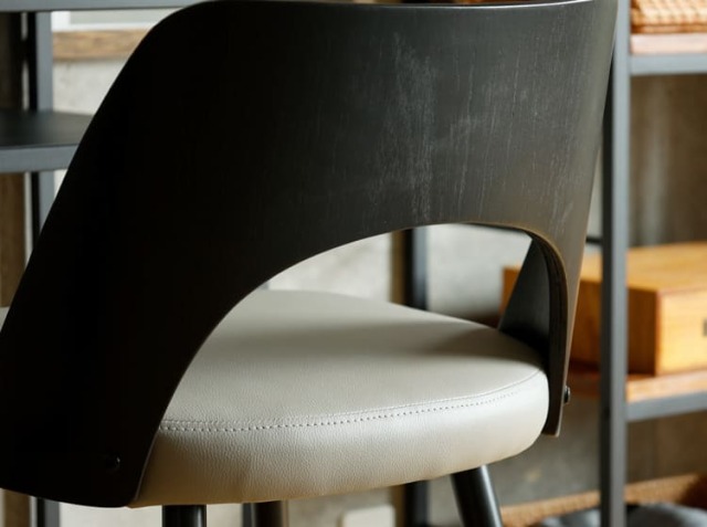 エイジング加工が施されたPUレザーと曲木加工が施された積層合板をブラックカラーに仕上げた背もたれがヴィンテージ感を醸し出してくれる、カウンターチェア、Vecto(ベクト)。
