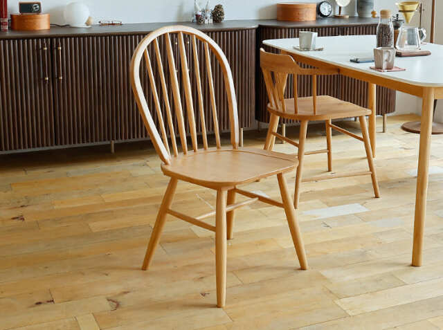 こちらのチェアの特徴は何といっても背もたれの6本のスポーク。イギリスのウィンザーチェアを彷彿させるデザインは、ナチュラルさを感じる雰囲気を演出してくれます。北欧テイストな雰囲気が漂うウィンザーチェアのようなデザインは、“座る”だけじゃもったいない。リビングやエントランスに置くだけで、空間の雰囲気をグッと深みのあるものに変えてくれますよ。