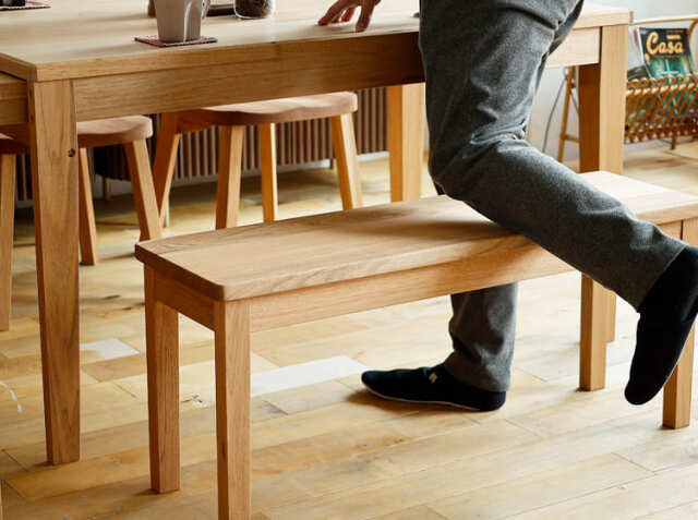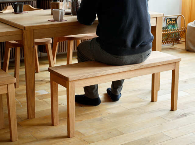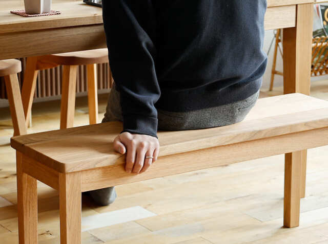 ベンチスタイルのダイニングの特徴はなんといっても背もたれがない分、空間がすっきり広くみえること。背もたれがなく、座面だけが低位置で直線的に続くので、視界をさえぎることなくスッキリ見せる事ができるのも特徴です。