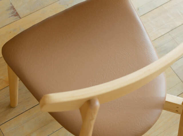 木目の美しいアッシュ材をふんだんに使用したフレームと、キャメルカラーのPVC(合皮)レザーを組み合わせたシンプルながらデザイン性を感じるダイニングチェア、Sovl(ソヴル)ナチュラルタイプ。