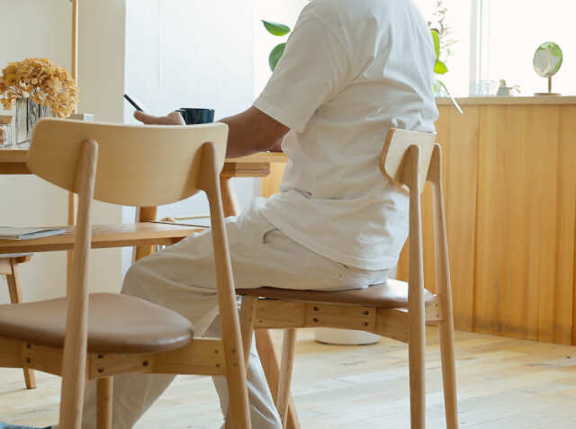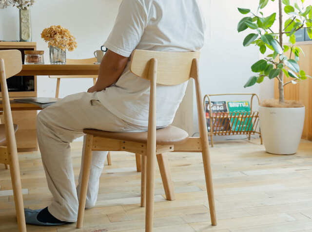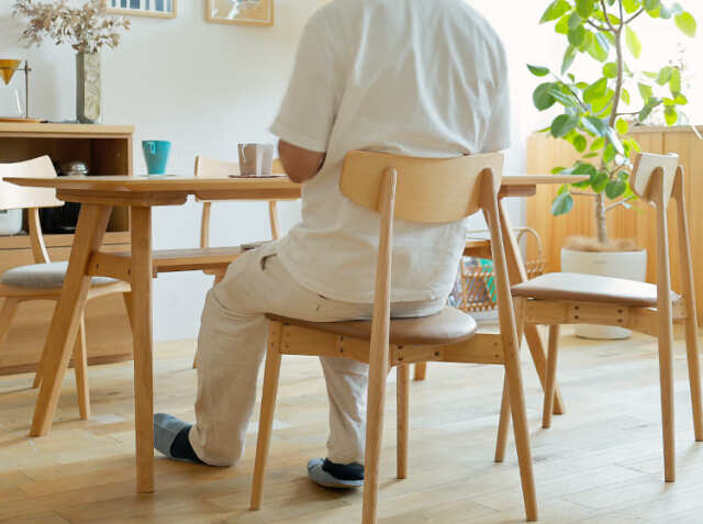 背中をもたれたときにフィットするように背もたれは弧を描いた設計に仕上げていますので、座った時にしっかり背中にフィットしてくれて安心感がうまれるデザインに仕上げていますので、リラックスして食卓での時間を過ごすことができますよ。