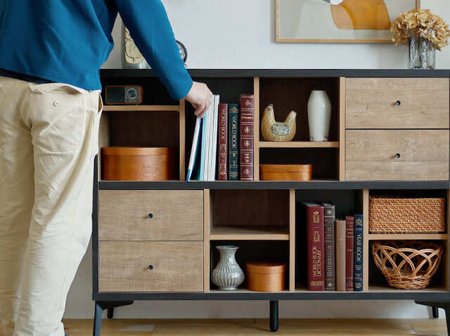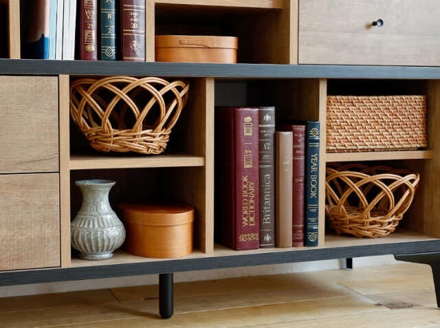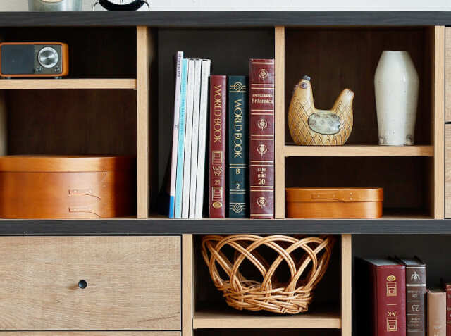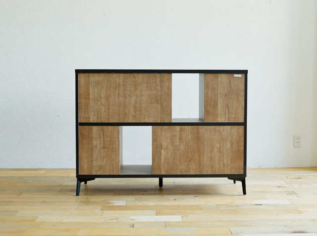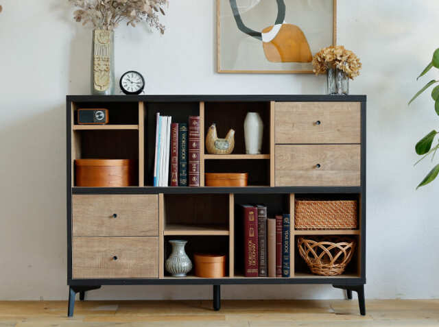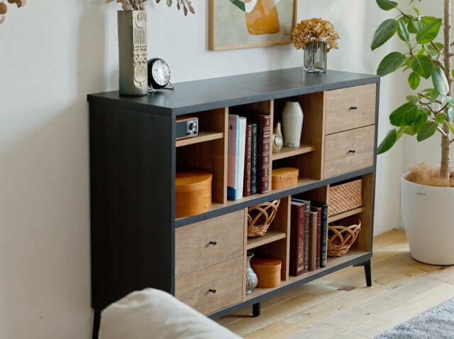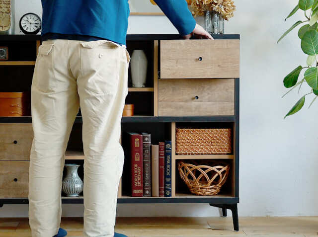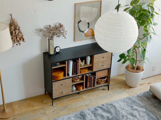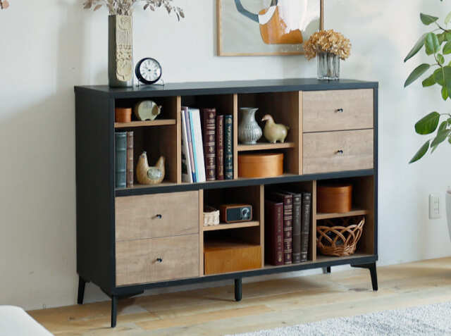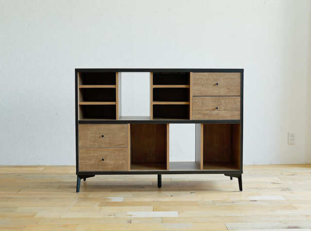 3種類の収納をあえて不規則に配置することでデザイン性を高めたヴィンテージテイストの幅120cmの国産シェルフ、tanas(タナス)。オープン収納と引出し収納、棚板収納で“見せる収納”と“隠す収納”を使い分けることができますよ。