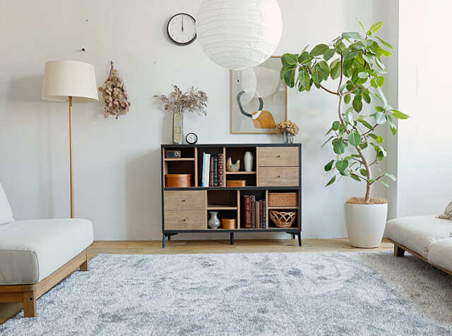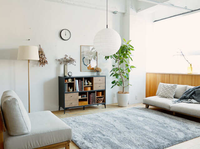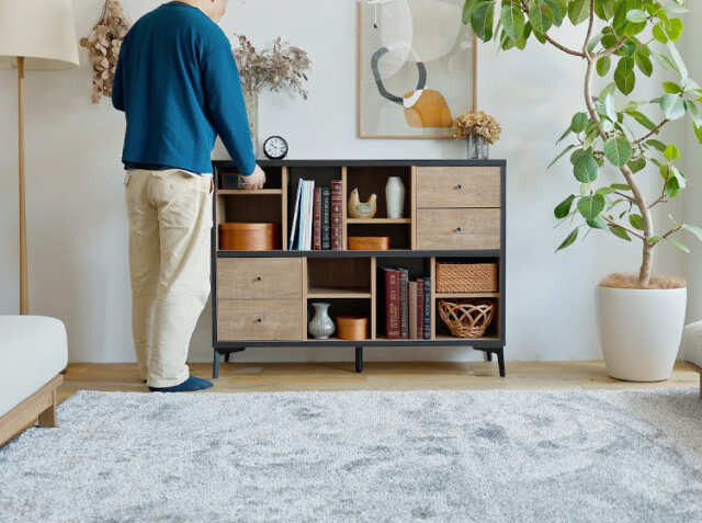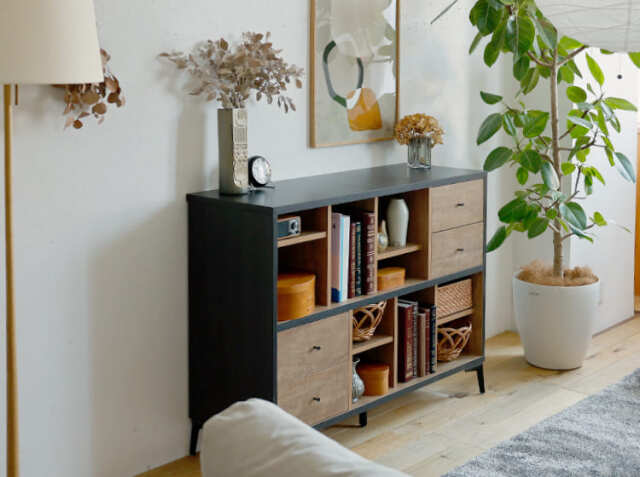 お気に入りの北欧オブジェや雑貨、グリーンやお花は、オープン収納棚で“飾る”ように収納。 生活感の出やすい雑多な収納物は、引き出し収納で“隠す”。“飾る”と“隠す”でお部屋をおしゃれに、そして上質な空間に仕上げてくれるシェルフとなっています。