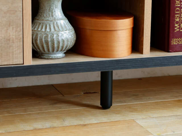 引出し収納には、ワンポイントでブラックスチールのちょこんとした取っ手を採用しています。天然木を再現したヴィンテージぽい前板との組み合わせがおしゃれな雰囲気を演出してくれますよ。