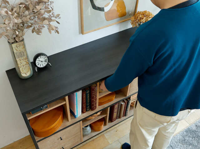 奥行きは40cmとスリムな設計にしていますので、お部屋に置いた時の圧迫感を軽減してくれます。また天板には普段よく使うものやお気に入りの雑貨などを置いてディスプレイを楽しむこともできますよ♪