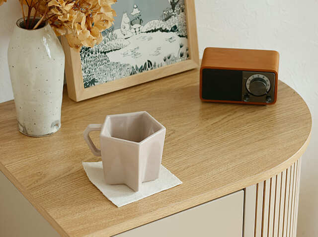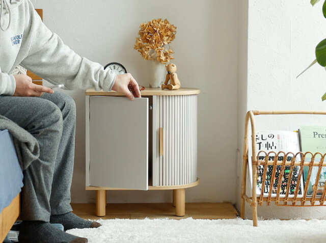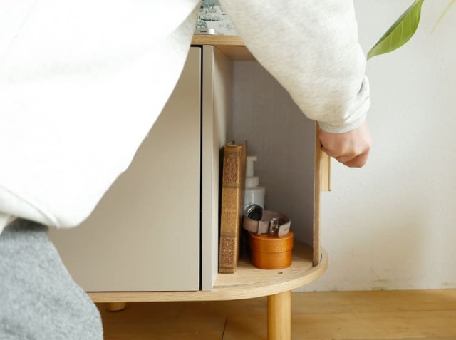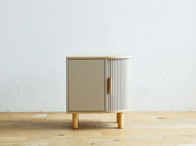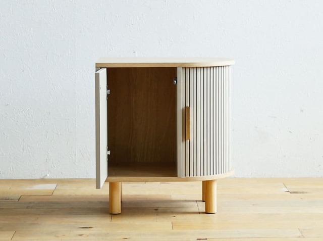 きれいな曲線のタンブールドア(ジャバラ)を用いたサイドキャビネット、Kooe(クーイ)。ナチュラルな木目の温もりと、丸みを帯びた木製の脚が生み出す軽やかさは、どんな空間にも優しく馴染む美しさを持っています。