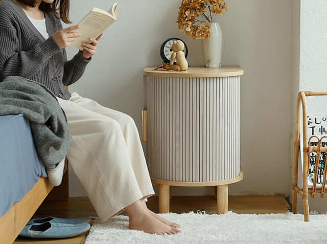 ベッドに入る前の時間は、一日の疲れを癒し、心を整える大切なひととき。このキャビネットには、そんなリラックスタイムに必要なものをすべて収納できます。お気に入りの本や雑誌、タブレット端末を入れておけば、ベッドの中で読書を楽しめますし、アロマオイルやキャンドル、ハンドクリームなどのリラックスグッズも手の届く場所に。スマートフォンの充電器やイヤホンも、タンブールドアの中にすっきりと収納できます。必要なものがすべて手元にありながら、扉を閉めれば生活感は完全に隠れますよ。