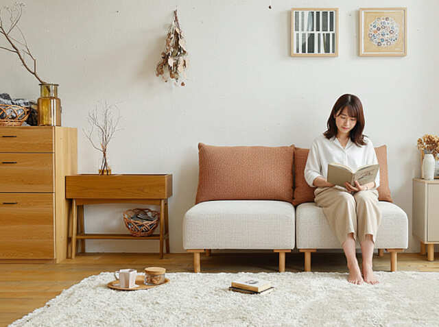 このユニットソファーは、適度な硬さを持つ“ハリのある”クッション性。体をしっかり支えながらも、硬すぎない絶妙なバランス。長時間座っていても疲れにくく、読書や映画鑑賞、在宅ワークにも対応できる快適性を実現しています。