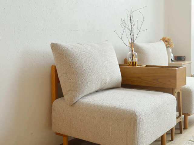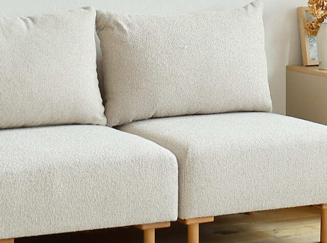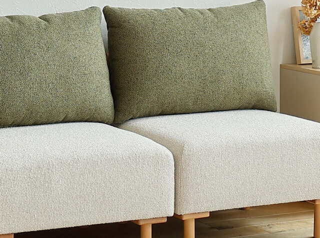 ソファ全体を支える丸みを帯びた天然木ビーチ無垢材を使用。木の温もりが、ファブリックの柔らかさと調和し、ナチュラルモダンな雰囲気を演出してくれます。