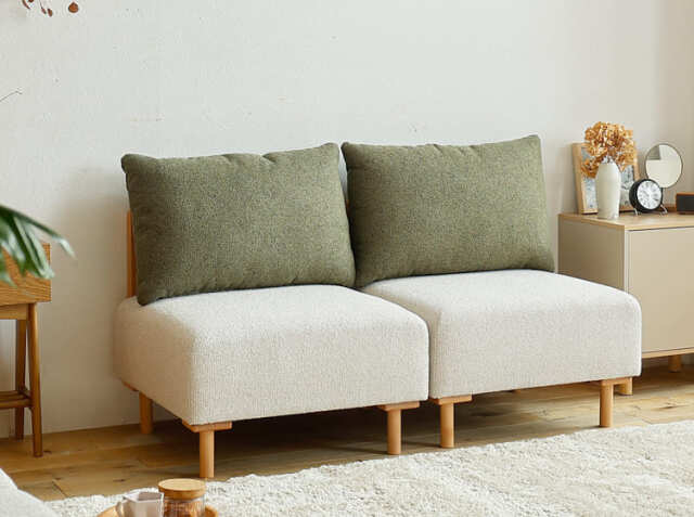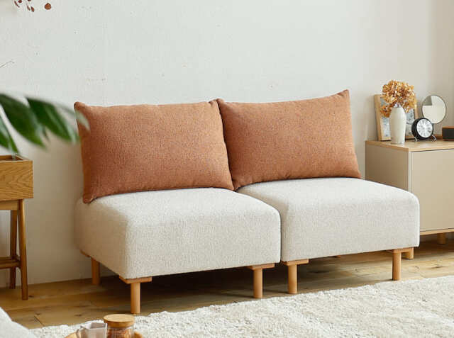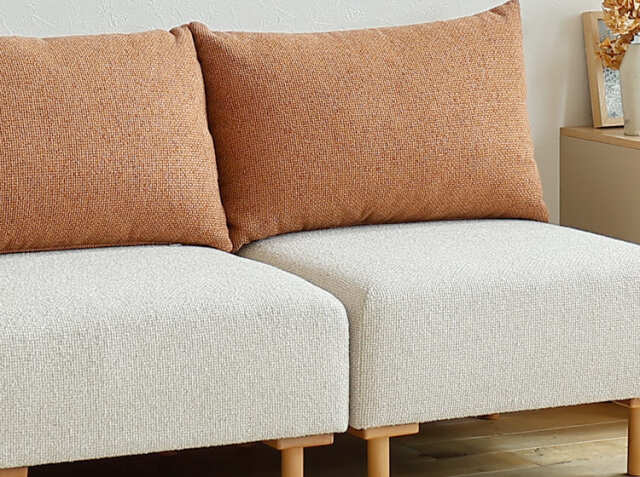 自由に組み合わせる、暮らしに寄り添う幅64.5cmの1人掛けソファを2つ組み合わせたユニットソファー、SELF(セルフ)。背クッションのカラーはアイボリー、モスグリーン、テラコッタオレンジの3色展開となっています。