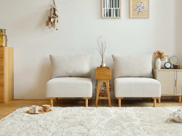 間にサイドテーブルを置けば、飲み物やお菓子を置くスペースも確保。ホスピタリティあふれる、おもてなし空間が生まれます。友人を招いてのお茶会、パートナーとの語らい、家族での団らん。顔を見合わせて座ることで、自然と会話が弾むレイアウトに。