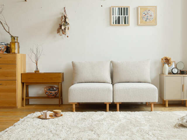 離して配置すれば、それぞれが独立した1人掛けソファーに。一人の時間を大切にしたい時、それぞれが別のことをしたい時に最適です。一つは読書用、もう一つは音楽鑑賞用。一つはリビングに、もう一つは寝室に。空間を分けて使うことで、家全体に快適な座る場所が生まれますよ。