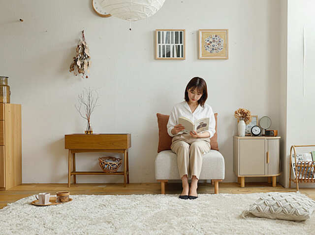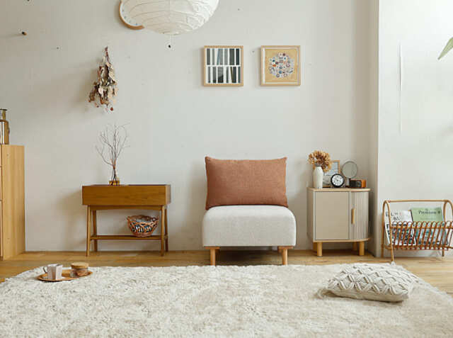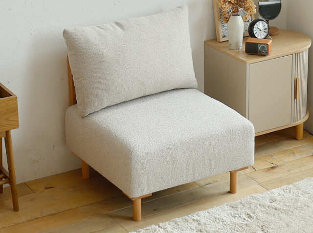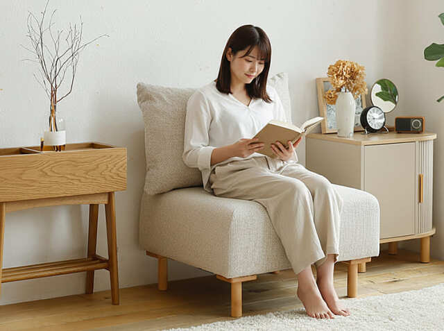 天然木の脚部との相性も抜群。木の温もりとアイボリーの柔らかさが響き合い、癒しの空間を作り出します。グリーンの観葉植物を添えれば、ナチュラルで心地よいリビングが完成しますよ。