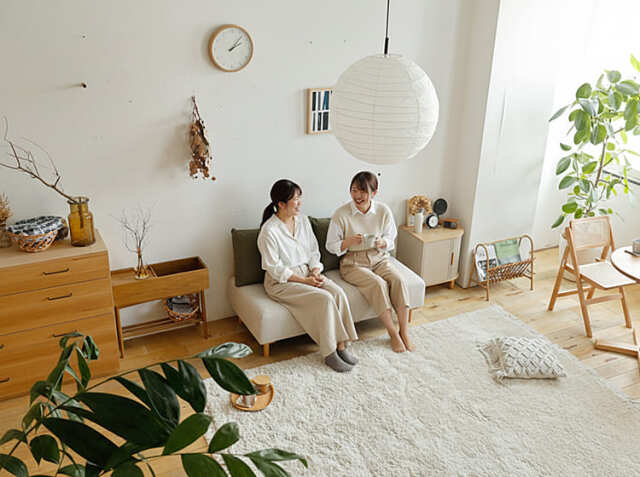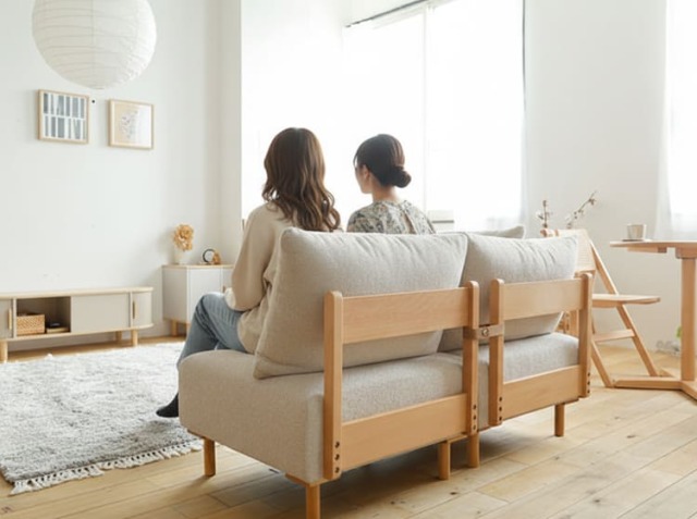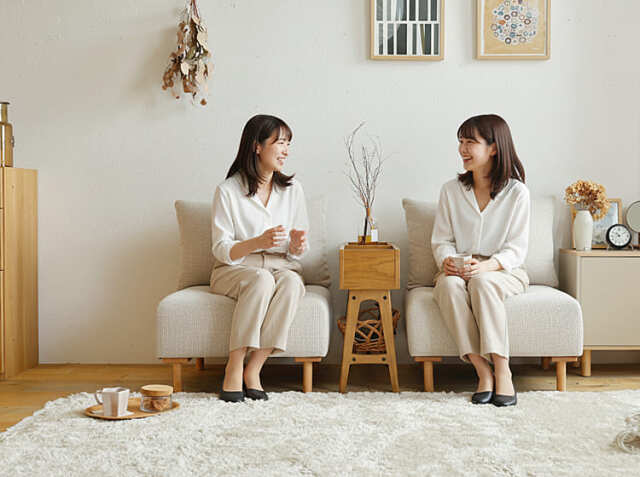 間にサイドテーブルを置けば、飲み物やお菓子を置くスペースも確保。ホスピタリティあふれる、おもてなし空間が生まれます。友人を招いてのお茶会、パートナーとの語らい、家族での団らん。顔を見合わせて座ることで、自然と会話が弾むレイアウトに。
