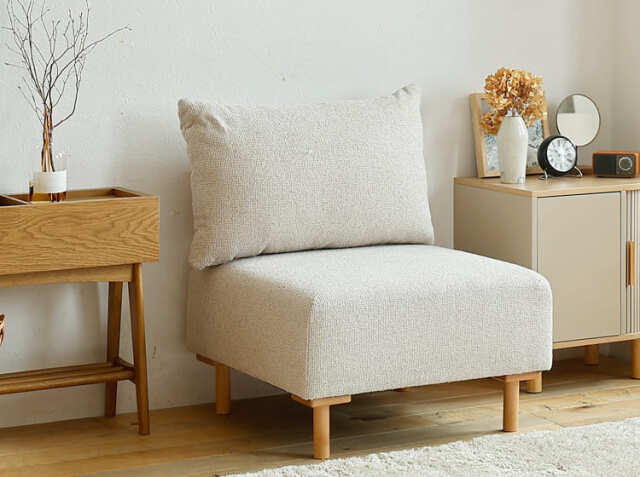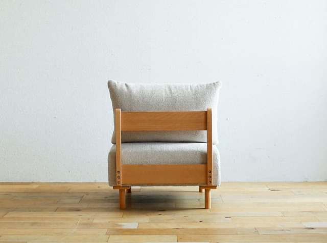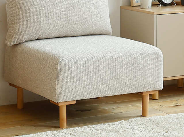 ソファ全体を支える丸みを帯びた天然木ビーチ無垢材を使用。木の温もりが、ファブリックの柔らかさと調和し、ナチュラルモダンな雰囲気を演出してくれます。