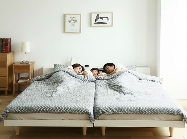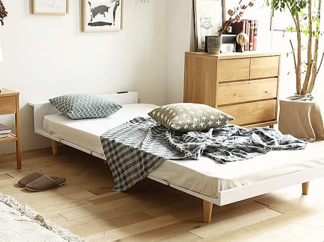 フラットなデザインのため、ベッドを横にぴったりとくっつけることができます。シングルサイズを2台並べて、小さなお子さまを真ん中に挟んで寝ることもできますよ。