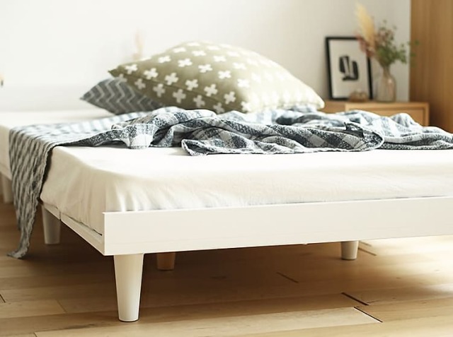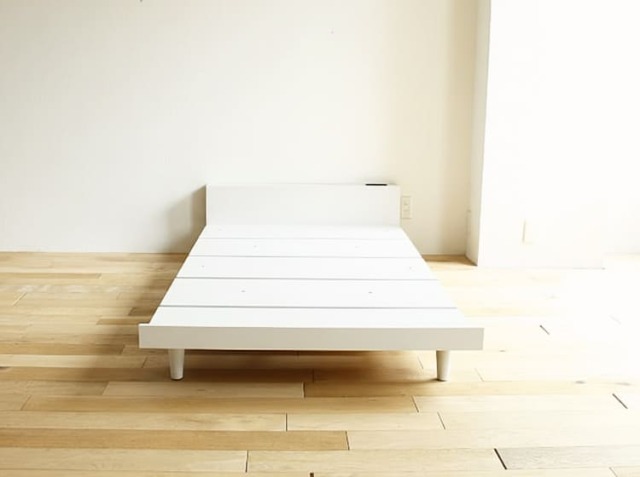 ロータイプのベッドは、お部屋に圧迫感を与えずスッキリとした印象をあたえてくれます。爽やかなホワイトカラーは、北欧テイストの優しい雰囲気を醸し出してくれて温かみも感じます。ヘッドボードには、2個口のコンセントが付いていますのでスマホを充電ができますので、スマホを目覚まし代わりにしている方には嬉しいポイントですね♪