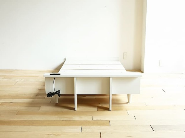ヘッドボード部分にはスマホなどの充電ができる2個口のコンセントとUSBポートがついていて、棚板の奥行きも10cmとスマホや目覚まし時計を置くのにちょうどいいサイズとなっています。