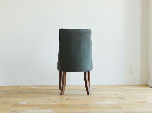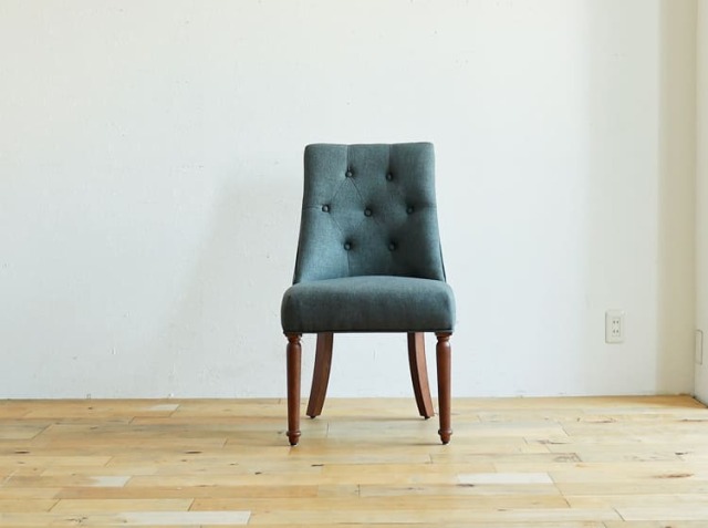 背もたれのボタン留めを見てください♪均等に並んだ丸いボタンが、ファブリックをきゅっと引き絞って、立体的な陰影を作り出しています。これ、チェスターフィールドソファでおなじみの「タフティング」という伝統的な技法なんです。ヨーロッパの格式ある家具に使われてきたデザインが、日本の普通のダイニングに自然に馴染んでいる——そのさりげなさが、なんともいえずおしゃれだと思いませんか?