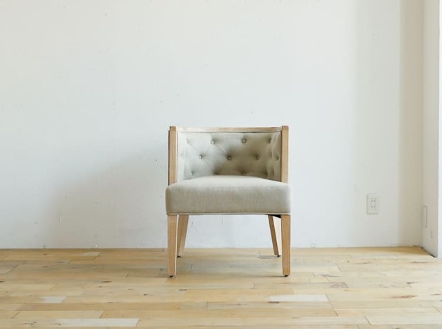 やわらかなフォルム、そしてゆるやかにカーブを描くアームレスト、ダイヤ柄のキルティングが施された背面、そしてボタン留めのさりげないアクセントがアンティークさを感じさせてくれるダイニングチェア、Frory(フローリ)ロータイプ。カラーは、ベージュ×ナチュラル脚とブルーグレー×ダークブラウン脚の2色からお選びいただけます。