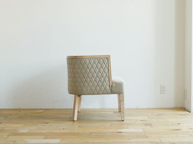 背面のダイヤ柄キルティング。椅子の後ろ側まで、ちゃんとデザインされています。ダイヤ形に縫い合わされたキルティングは、立体感があって美しい。椅子の後ろ姿まで気を使っているって、なんかいいですよね。部屋のどこから見ても絵になる椅子です。