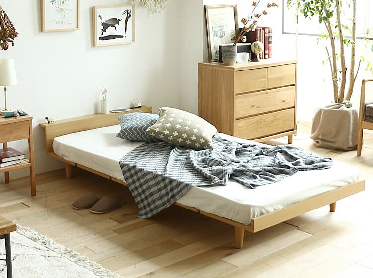 高さを抑えたロータイプのフロアーベッド、PIATTO(ピアット)ヘッドボード付きタイプ。ヘッドボード部分にはスマホなどの充電ができる2個口のコンセントがついていて、棚板の奥行きも10cmとスマホや目覚まし時計を置くのにちょうどいいサイズとなっています。