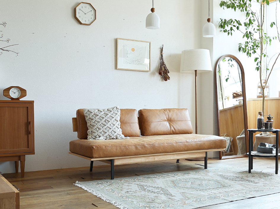 天然木ラバーウッド無垢材&キャメルカラーのクロスレザーの組み合わせがヴィンテージテイストのコーディネートにぴったりの3人掛けソファー、form(フォーム)。
