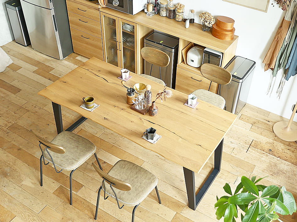 天然木オーク突板の木目や節具合の様々な表情を楽しむことができる幅180cmのダイニングテーブル、Notto(ノト)。一枚板風に仕上げたデザインは、荒々しい木感や節などの違いで食卓におしゃれな存在感を与えてくれます。