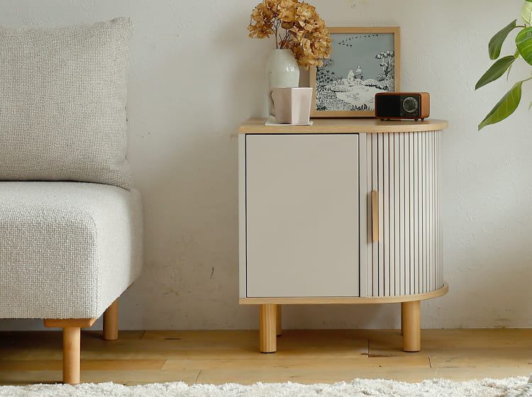 きれいな曲線のタンブールドア(ジャバラ)を用いたサイドキャビネット、Kooe(クーイ)。